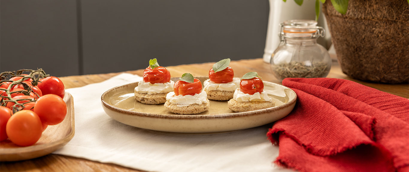 Com a ajuda de um molde, corte o pão em pequenos círculos. Leve ao forno até ficar levemente crocante e reserve. No processador, bata a ricota com o iogurte natural, uma pitada de sal e um fio de azeite até virar uma pasta firme e homogênea. Reserve. Lave os tomatinhos e coloque numa assadeira com as ervas frescas e o alho inteiro e com casca. Regue com um azeite de oliva. Leve ao forno por 20 minutos, em seguida, deixe esfriar e reserve. Para montar, coloque um pouco da pasta de ricota sobre as bases de pão, acrescente um tomatinho e, por fim, uma folha de manjericão.